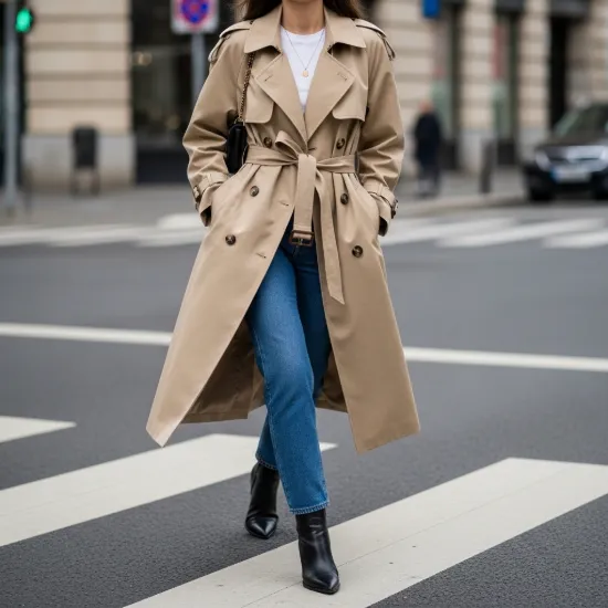 • Tasarım Detayları: Klasik çift düğmeli (double-breasted) ön kapama, omuzlarda ikonik apoletler ve kollarda ayarlanabilir kemer tokaları mevcuttur. Geniş ve dökümlü yaka tasarımı, açık bırakıldığında modern bir salaşlık sunarken, kapatıldığında tam bir koruma sağlar. Beldeki geniş kuşağı, stili kişiselleştirmenize ve bel hattınızı vurgulamanıza imkan tanır.