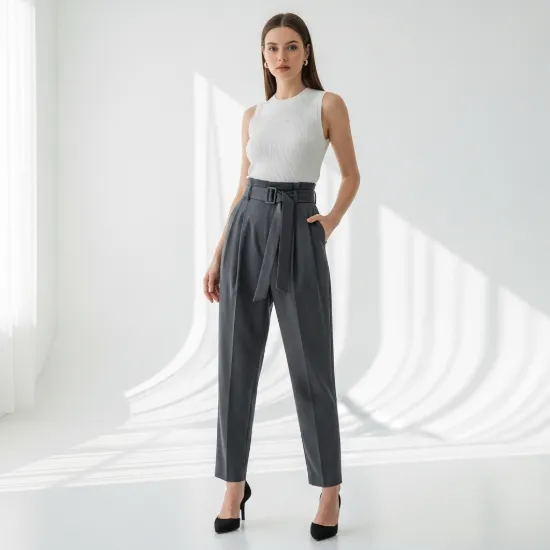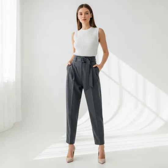 • Tasarım Detayları: Yüksek bel bandı, gizli kanca ve fermuar kapama ile temiz bir ön görünüm sunar. Yanlarda derin fonksiyonel cepler, arkada ise estetik amaçlı sahte fileto cepler bulunur. Kendi kumaşından hazırlanan çıkarılabilir kemeri, beli vurgulamak için idealdir.